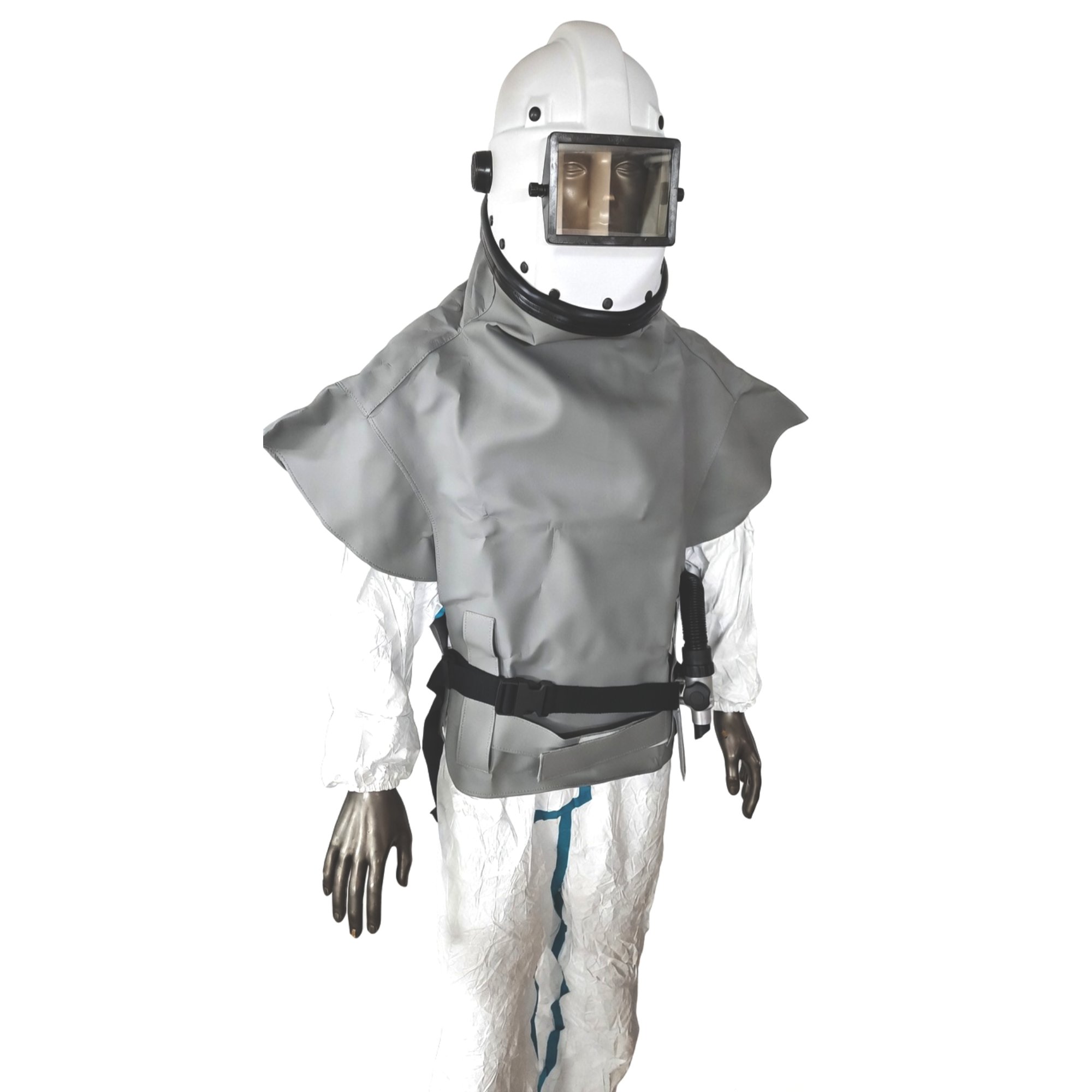 The Spasciani ACS 952 sandblasting respirator is a constant-flow air line breathing system with a robust ABS helmet and protective waistcoat, designed for heavy sandblasting work. It delivers fresh adjustable airflow with a low-flow alarm while shielding both respiratory pathways and upper body from abrasive particles. Certified to EN 14594:2005 for industrial safety.