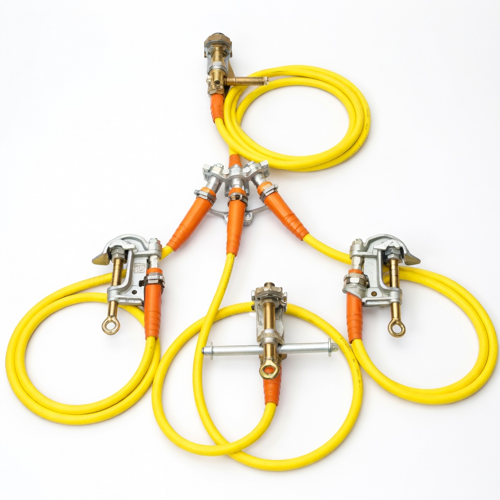 The Four-Way Connector Grounding Set is designed for effective grounding of three-phase electrical systems. It creates a common connection between conductor leads and the ground lead, ensuring safety during maintenance. The set includes a durable connector, serrated clamps, copper cable, and accessories, offering reliable performance with high fault current capacity for industrial and utility applications.